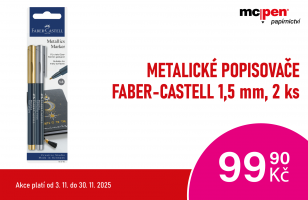 Přijďte v období 3.11.2025 až 30.11.2025 do naší prodejny McPen papírnictví a pořiďte praktické balení 2 kusů metalických popisovačů od značky Faber-Castell ve zlaté a stříbrné barvě za akční cenu 99,90 Kč!