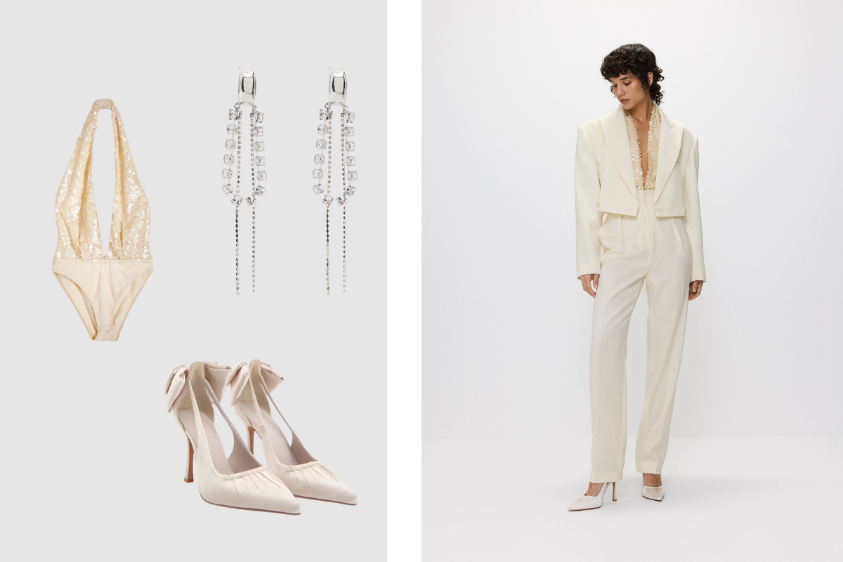 Visací náušnice se zirkonem, RESERVED, orientační cena 599; Ladies‘ Pumps, RESERVED, orientační cena 1 199 Kč; Kalhoty s vysokým sedem z lyocellu, RESERVED, orientační cena 1 799 Kč; Krátké sako z lyocellu, RESERVED, orientační cena 2 999 Kč; Flitrové body, RESERVED, orientační cena 1 399 Kč