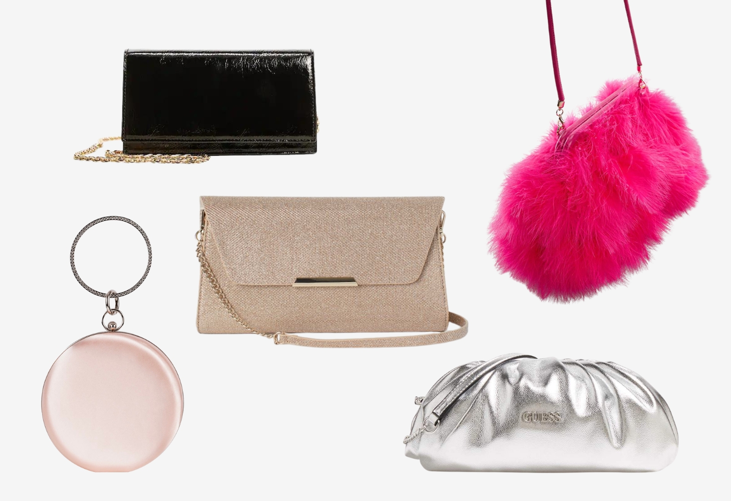 Kabelka s klopou a řetízkem, MANGO, orientační cena 599 Kč; Kabelka s peřím, MANGO, orientační cena 1 599 Kč; Růžově perleťové psaníčko, H&M, orientační cena 299 Kč; Zlatá večerní kabelka WJS, WOJAS, orientační cena 749 Kč; Central City psaníčko, Guess, orientační cena 1 825 Kč